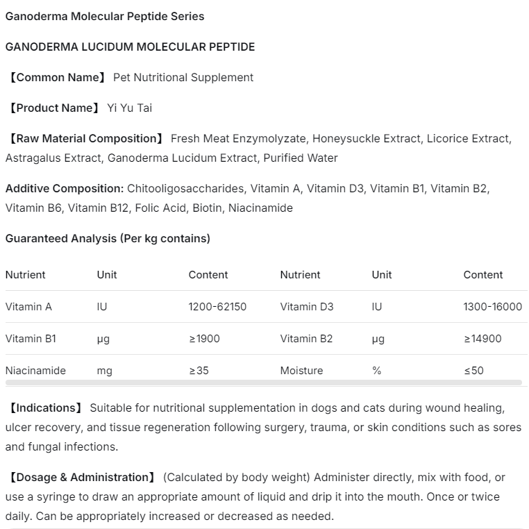 O Peptídeo Yiyu representa um avanço em suplementos para saúde e desintoxicação da pele de animais de estimação , formulados especificamente para tratar úlceras de pele, micose e condições dermatológicas relacionadas a toxinas em animais de estimação. Esta fórmula avançada combina a sabedoria da medicina tradicional chinesa com a biotecnologia moderna para fornecer suporte e purificação abrangente da barreira cutânea para cães e gatos .