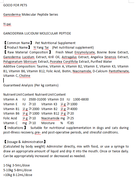 Yipai Biotechnology, um fabricante registrado pela FDA (Reg No. 13323196228) e certificado pela ISO 9001:2015, apresenta um suplemento nutricional inovador para animais de estimação, projetado para lidar com os impactos emocionais e físicos do estresse em animais de estimação. Nossa fórmula mescla Ganoderma Oil Pet Nutrition (um agente calmante proprietário) com suplementos de ervas para animais de estimação , proporcionando benefícios duplos: aliviar comportamentos de ansiedade e ao mesmo tempo repor nutrientes esgotados pelo estresse - com a confiança de parceiros B2B globais, incluindo redes veterinárias e atacadistas de produtos para animais de estimação.