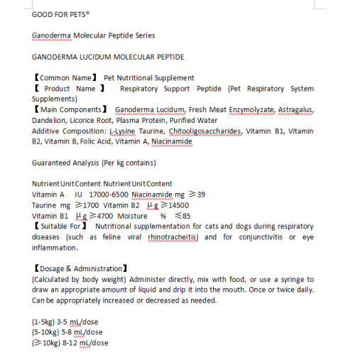 Combina Astragalus membranaceus, Glycyrrhiza uralensis e proteínas plasmáticas com Ganoderma lucidum para criar um complexo abrangente de melhoria do sistema imunológico, especificamente para a saúde respiratória canina.