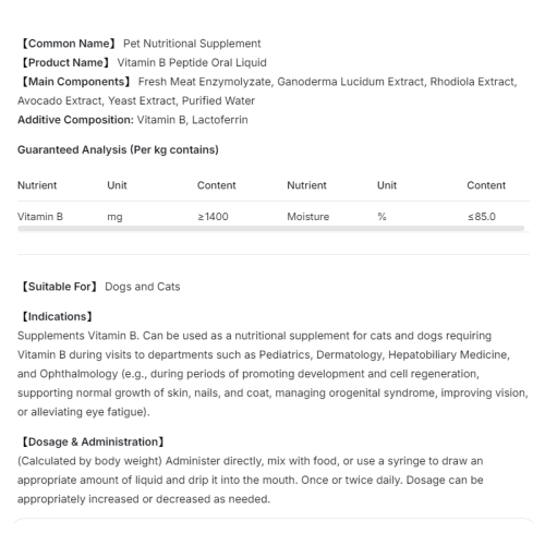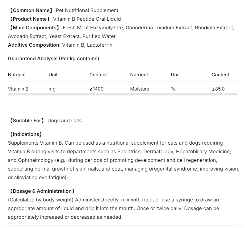 Como parte de nossa coleção premium de vitaminas orais especiais para animais de estimação, este produto representa nosso compromisso em desenvolver soluções de vitaminas para animais de estimação formuladas em veterinária que atendam aos mais altos padrões de segurança e eficácia.